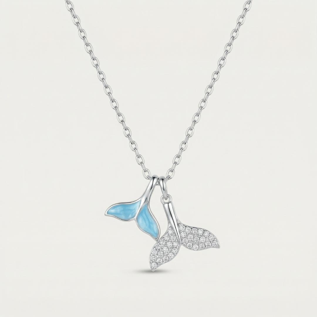 Due code di sirena che si incontrano e si completano: una in smalto blu oceano, profonda e vellutata; l’altra in pavé luminoso, come schiuma che brilla al sole.