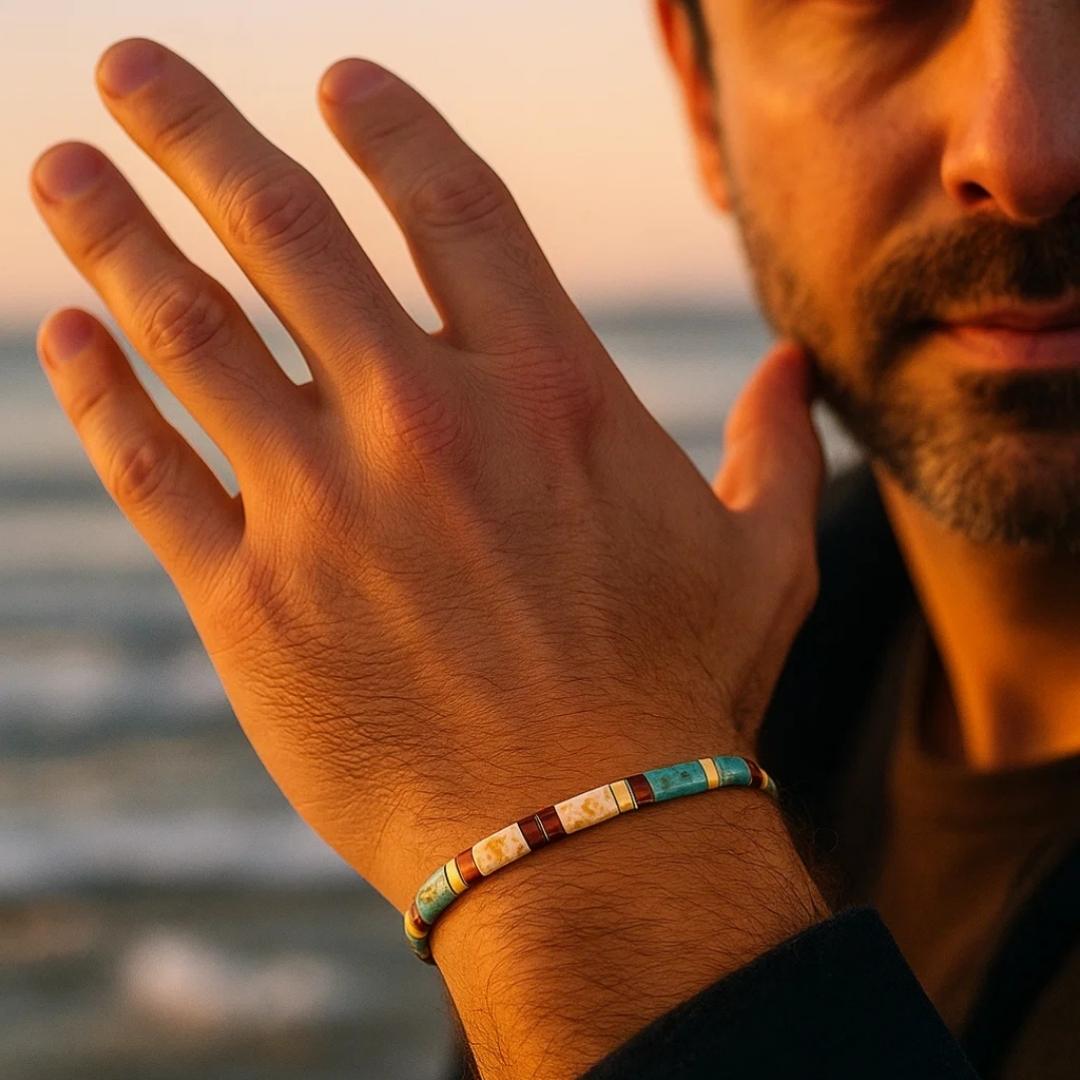 Linee pulite, carattere deciso: piccole tessere turchesi, avorio e bruno si alternano come scogli bagnati dalla marea. Un bracciale elastico, minimal e maschile, pensato per chi cerca un dettaglio marittimo discreto da indossare ogni giorno—solo o in stack con acciaio e pelle.
