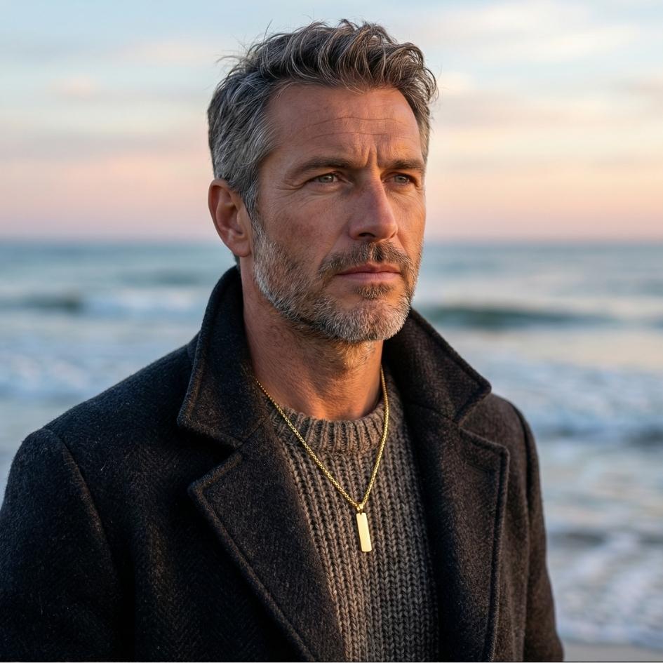 Questa collana nasce per gli uomini che amano il mare d’inverno: silenzioso, profondo, pieno di pensieri. Il ciondolo rettangolare segue il movimento del respiro, appoggiandosi al maglione o alla t-shirt come un piccolo talismano personale. Le linee sono pulite, maschili, essenziali – niente fronzoli, solo il metallo che cattura la luce del tramonto e un dettaglio discreto che racconta di orizzonti, vento salato e libertà.
