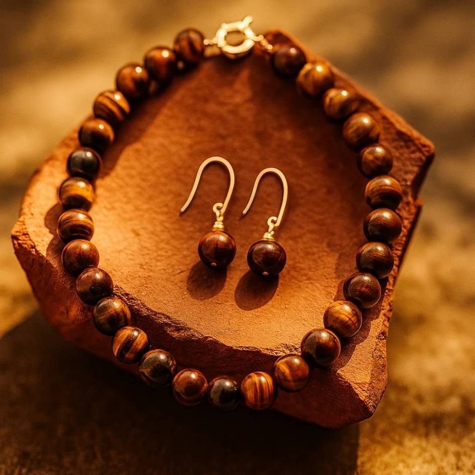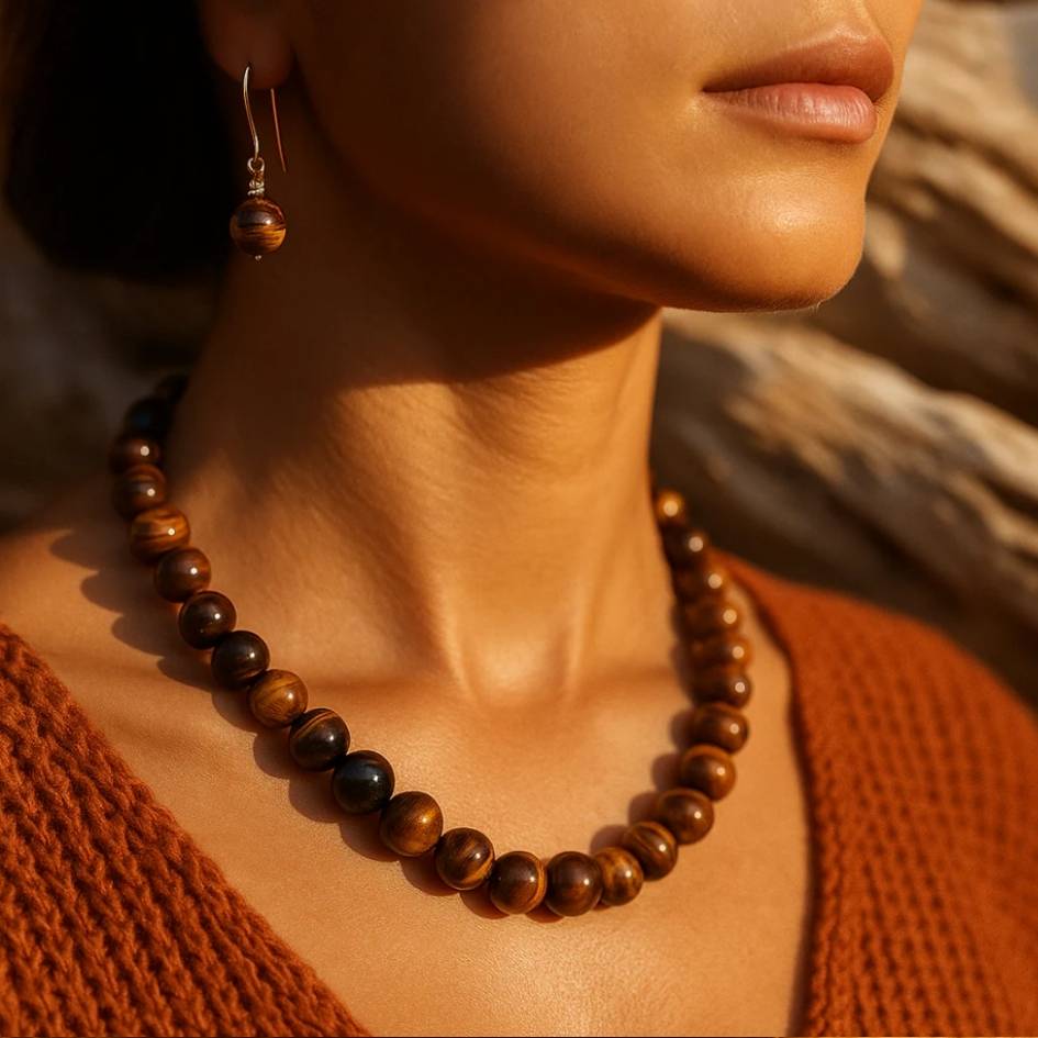 Un set che racchiude tutte le sfumature del tramonto autunnale. Le perle in pietra naturale, con i loro riflessi caldi e iridescenti, evocano la luce che si posa sul mare al calare del sole.
