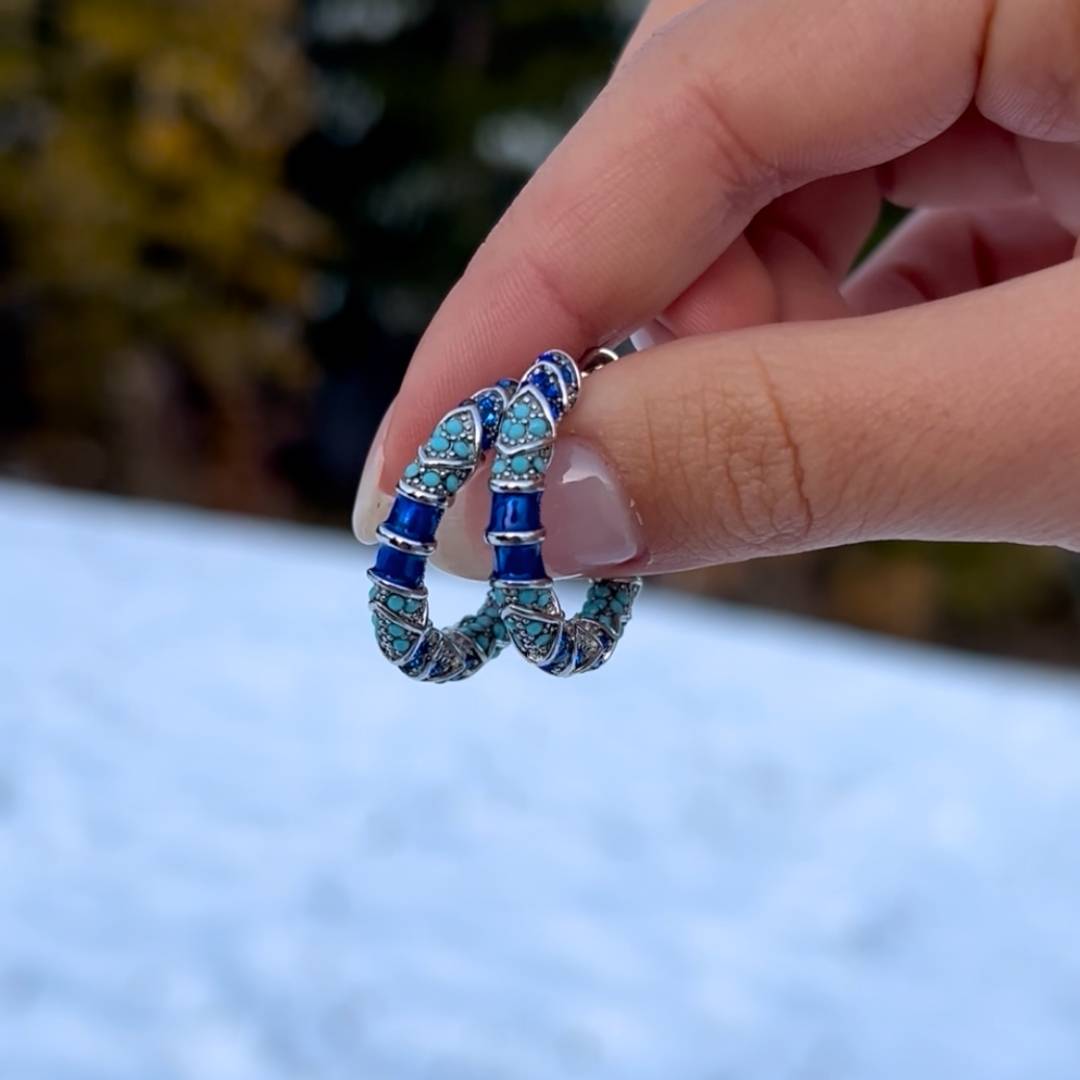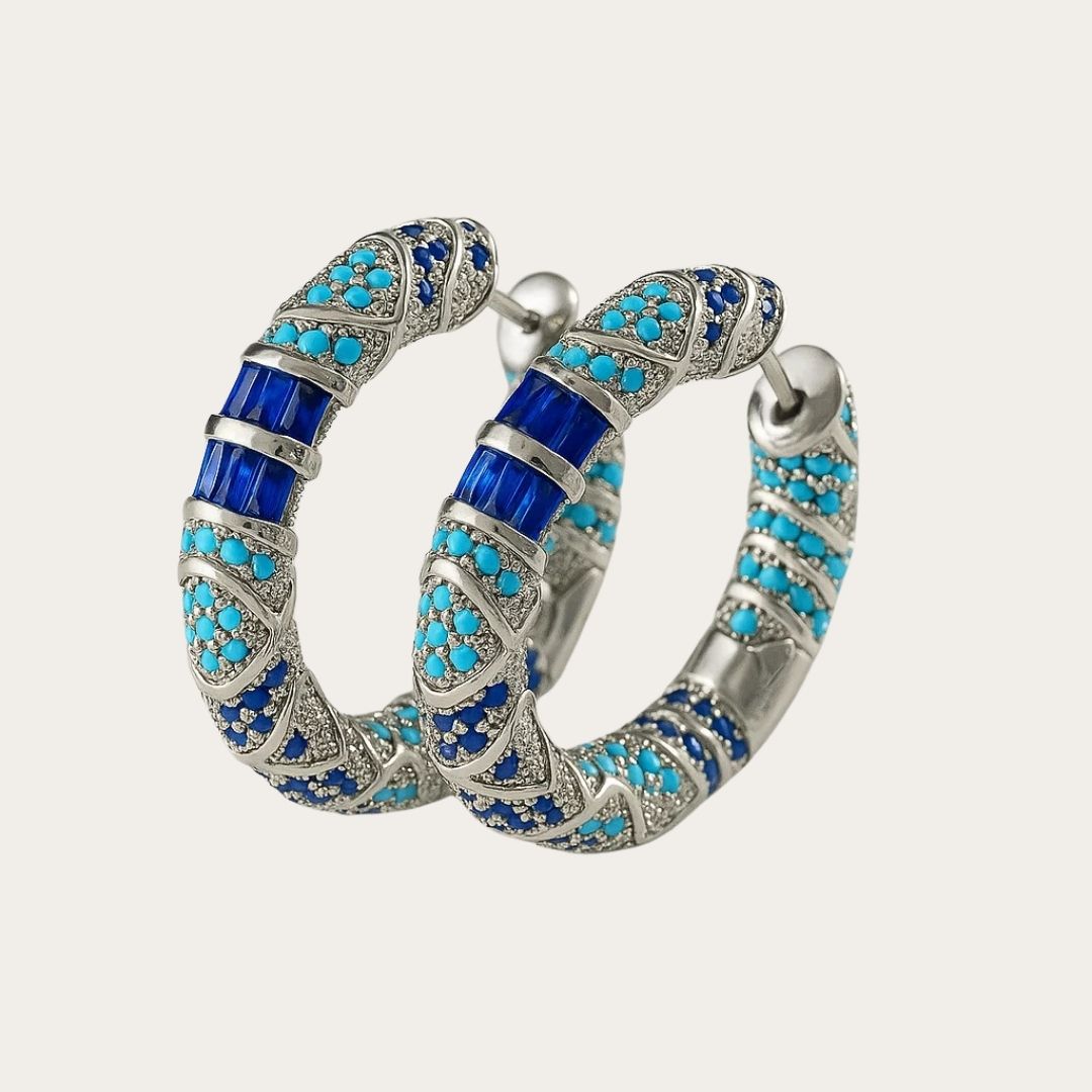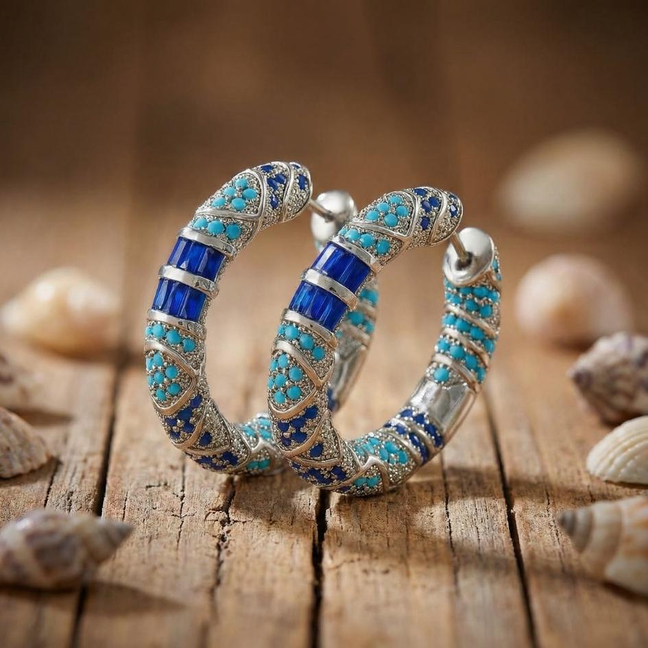 Cerchi scolpiti come piccole correnti: il blu profondo delle pietre incontra l’acciaio lucido in un intreccio boho, deciso e luminoso. Un richiamo al mare d’inverno, elegante senza eccessi.