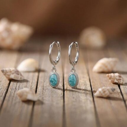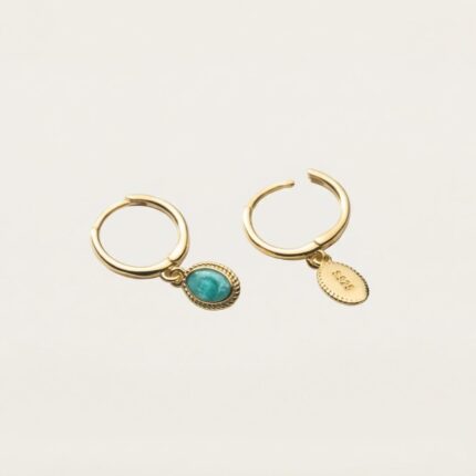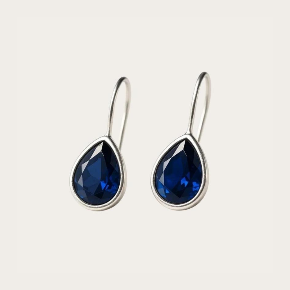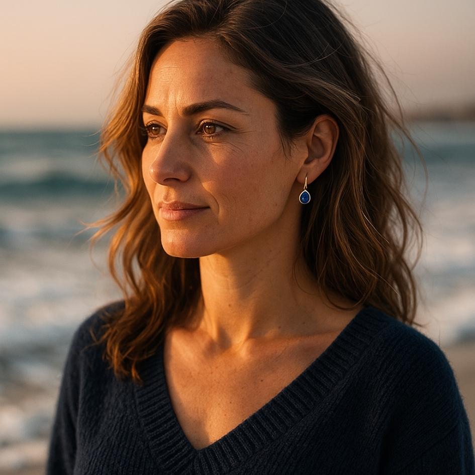 Una goccia blu profondo incastonata in linee pulite. Eleganza sobria, dal carattere boho: luce nitida che valorizza il viso con un tocco marino invernale.