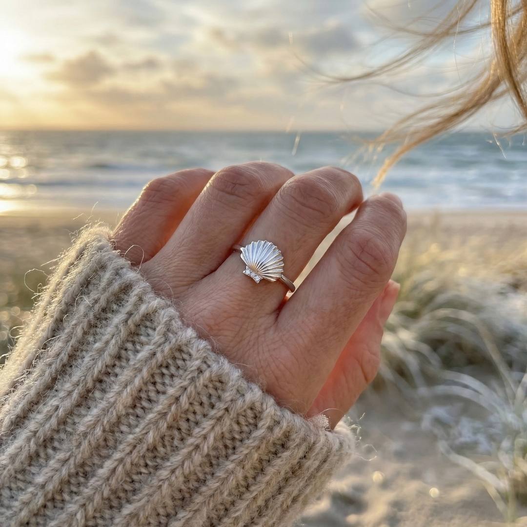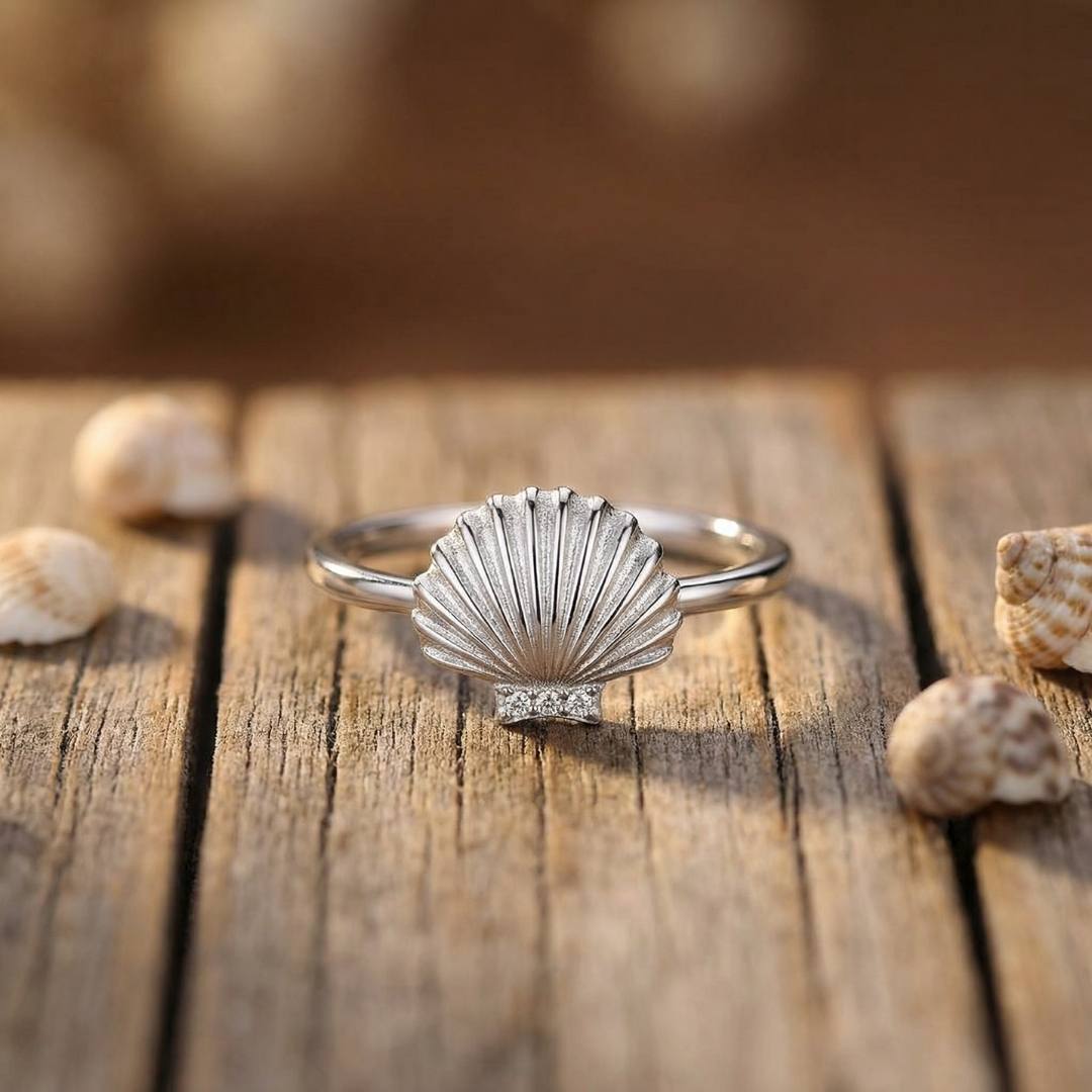 Realizzato con placcatura in argento sterling 925, con conchiglia centrale di circa 1 cm × 0,9 cm impreziosita da zircone luminoso. Anello regolabile, peso circa 1,6 g, ipoallergenico e resistente all’ossidazione, adatto alla maggior parte delle misure.