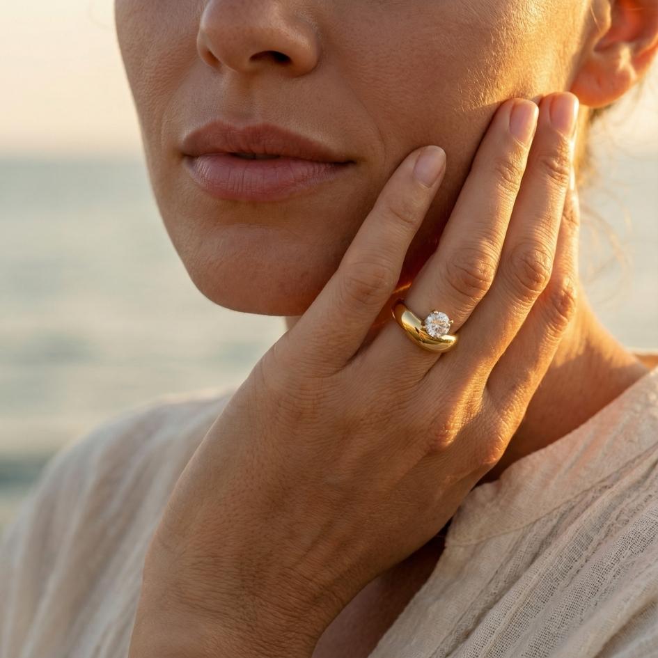 Aurena è un anello dal profilo pieno e morbido, come un’onda che abbraccia la riva, sormontata da un grande zircone chiaro che brilla come una luna piena sul mare calmo. Un gioiello essenziale ma scenografico, pensato per catturare la luce e lo sguardo a ogni gesto.
