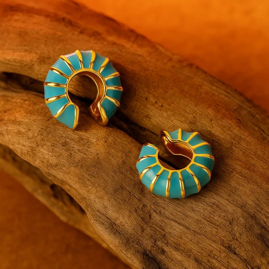 Realizzati in ottone dorato, con smalto turchese applicato a mano, questi orecchini sono dotati di una pratica chiusura a clip, pensata per unire comfort ed eleganza.