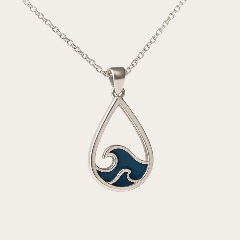 La collana Avelia è una goccia che racchiude il mare. Il suo pendente, leggero e armonioso, raffigura un’onda stilizzata in smalto blu, incastonata in una cornice a forma di goccia.