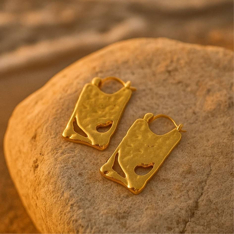 Gli orecchini Ayla sono realizzati in ottone dorato martellato, con forme irregolari e aperture che ricordano la forza creativa della natura. La superficie luminosa cattura i riflessi del sole al tramonto, trasformandoli in un bagliore caldo e vibrante. Sono un gioiello che celebra l’imperfezione organica e la libertà dello stile contemporaneo.