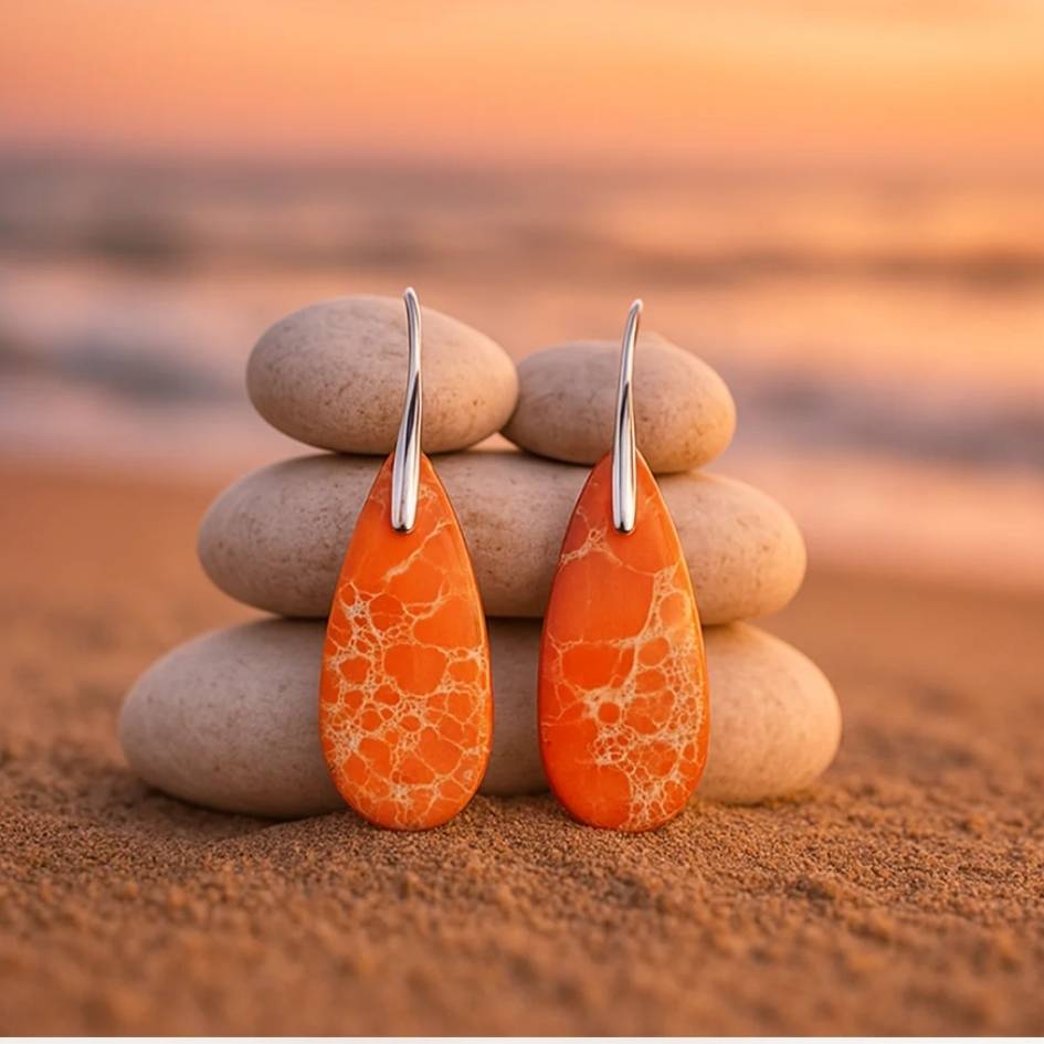 Gli orecchini Coralia si ispirano alla vibrante costa di Positano, dove i tramonti estivi tingono le case e le rocce di riflessi aranciati, caldi e avvolgenti.