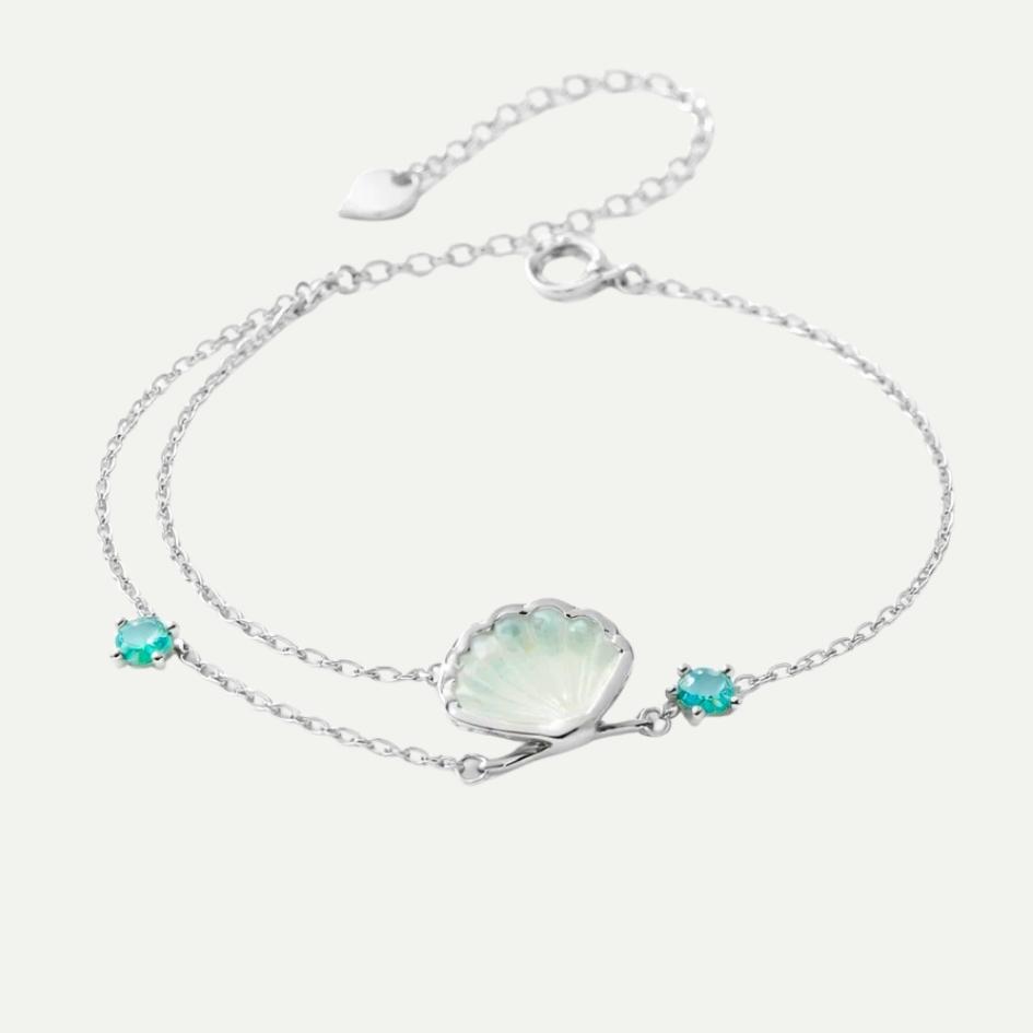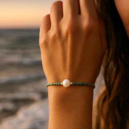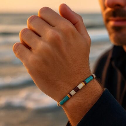 I piccoli cristalli turchesi accendono il polso come punti di luce sull’acqua, mentre il doppio strato della catena crea un movimento leggero, boho e marittimo.