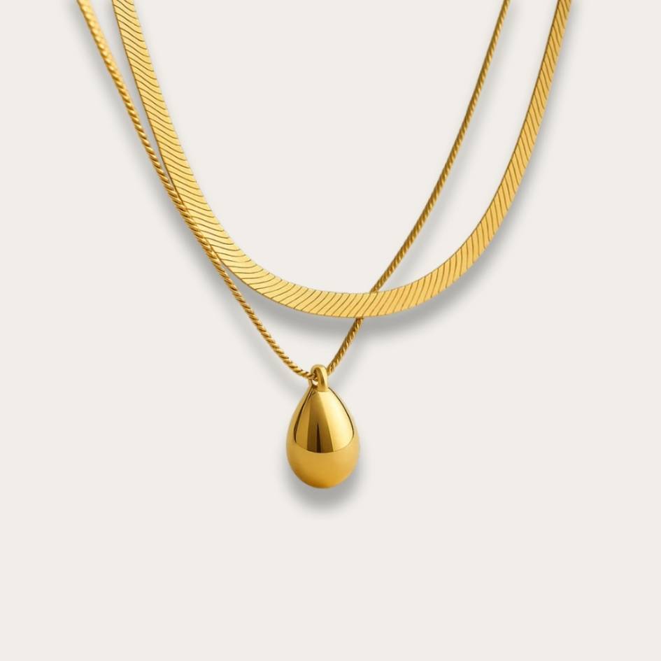 Composta da due catene in acciaio inossidabile dorato: una più sottile con pendente a goccia e l’altra piatta, a spiga, per un effetto a strati elegante e contemporaneo. Lunghezza totale: 45 cm. Resistente all’acqua, non scolorisce e non si ossida: perfetta da indossare ogni giorno, in ogni stagione.