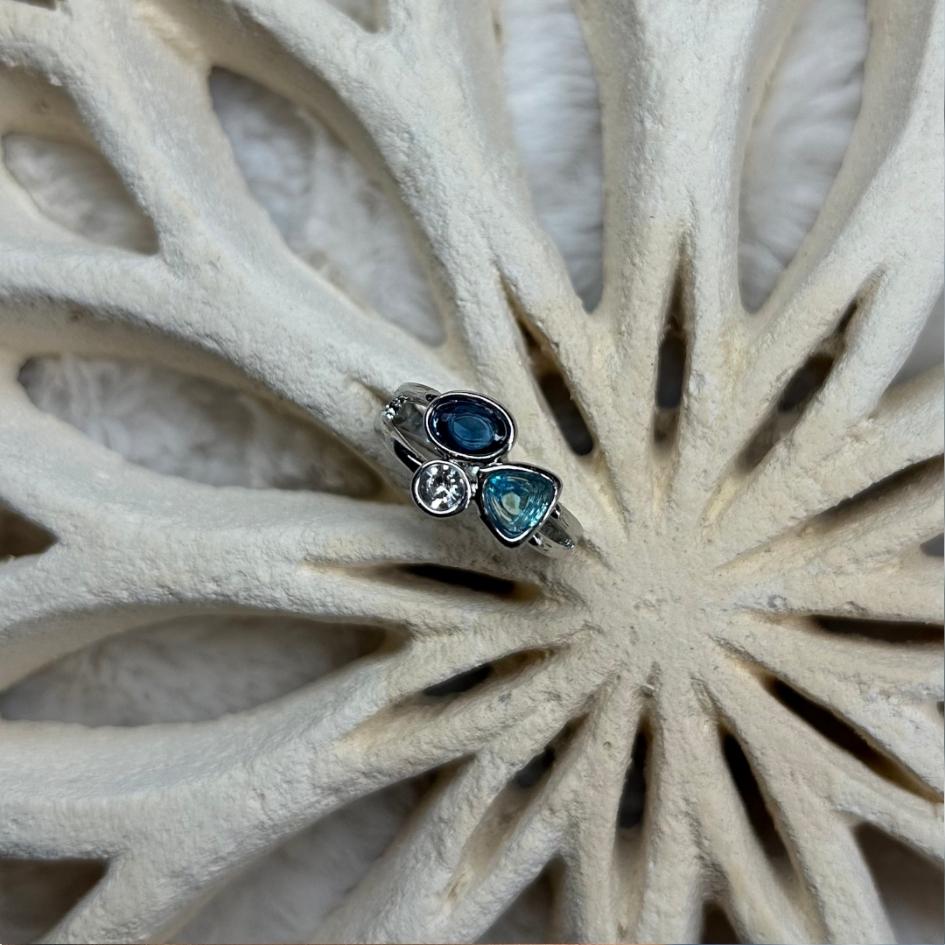 Un anello che racchiude la brillantezza del mare e del cielo, con tre pietre dai colori intensi che si illuminano ad ogni movimento.