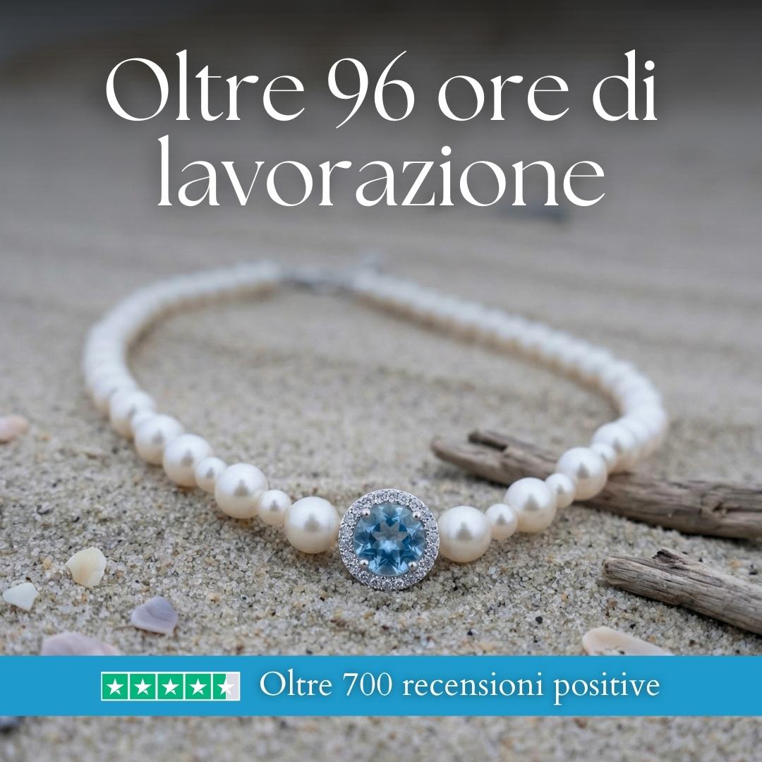 Realizzata con struttura argentata e con perle da laboratorio e acquamarina creata in laboratorio incastonata in un elegante punto luce centrale. Lunghezza di circa 40 cm, perfetta come girocollo luminoso da indossare da solo o in abbinamento ad altri gioielli I Segreti del Mare.