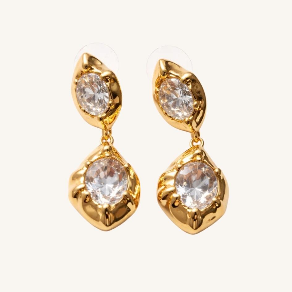 Realizzati in ottone placcato oro, con cristalli chiari effetto diamante incastonati a castone chiuso. Leggeri ma d’impatto, pensati per chi ama i gioielli che non passano inosservati e che aggiungono un tocco dorato a ogni outfit.