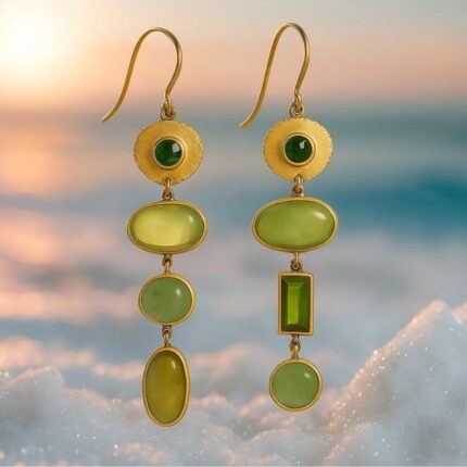 L’Amuleto del mare e` un gioiello sacro composto da perle lisce dalle sfumature giada e un pendente a goccia che riflette i colori cangianti delle rive bagnate dalla marea.