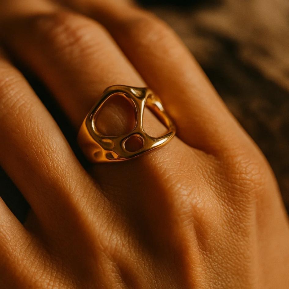 Un anello che unisce eleganza e originalità, con linee vuote e sinuose che sembrano scolpite dalla natura stessa.