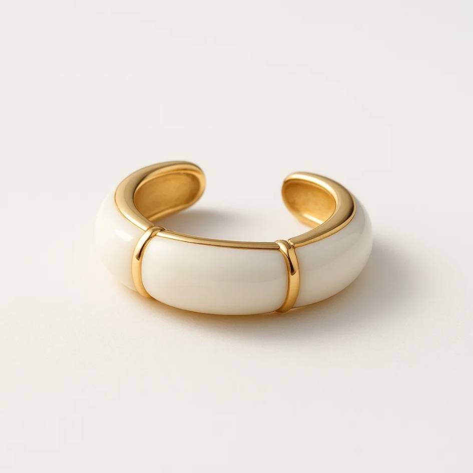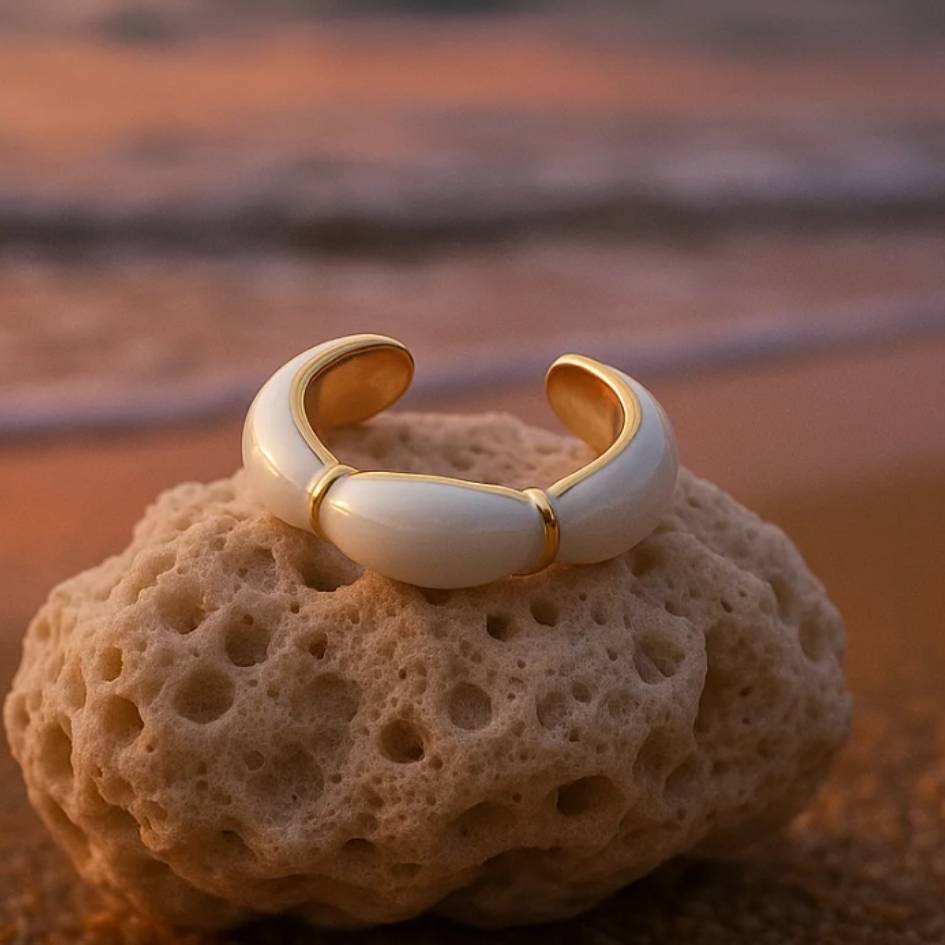 L’anello Isolde si distingue per le sue linee morbide e luminose, smaltate a mano con cura artigianale. Il bianco lucente, esaltato dai profili dorati, richiama la purezza delle onde che si infrangono al tramonto, trasformandolo in un gioiello raffinato e senza tempo.