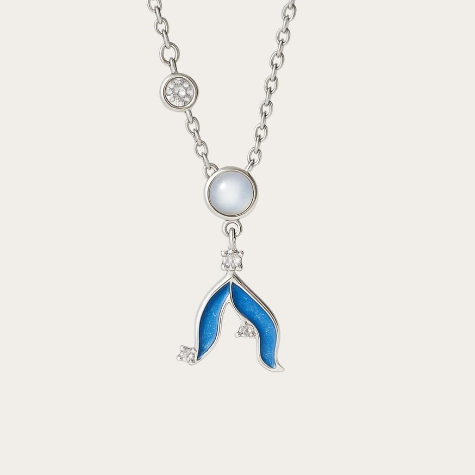 Lunarya è una piccola coda di mare che scende leggera al centro del décolleté, illuminata da una pietra di luna morbida e lattiginosa. Il blu intenso dello smalto richiama il mare di notte, mentre i punti luce aggiungono un tocco di magia ad ogni movimento.
