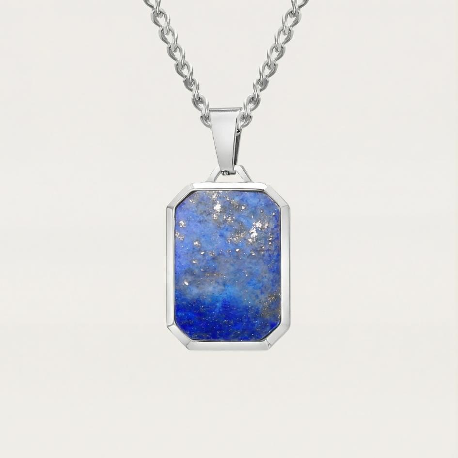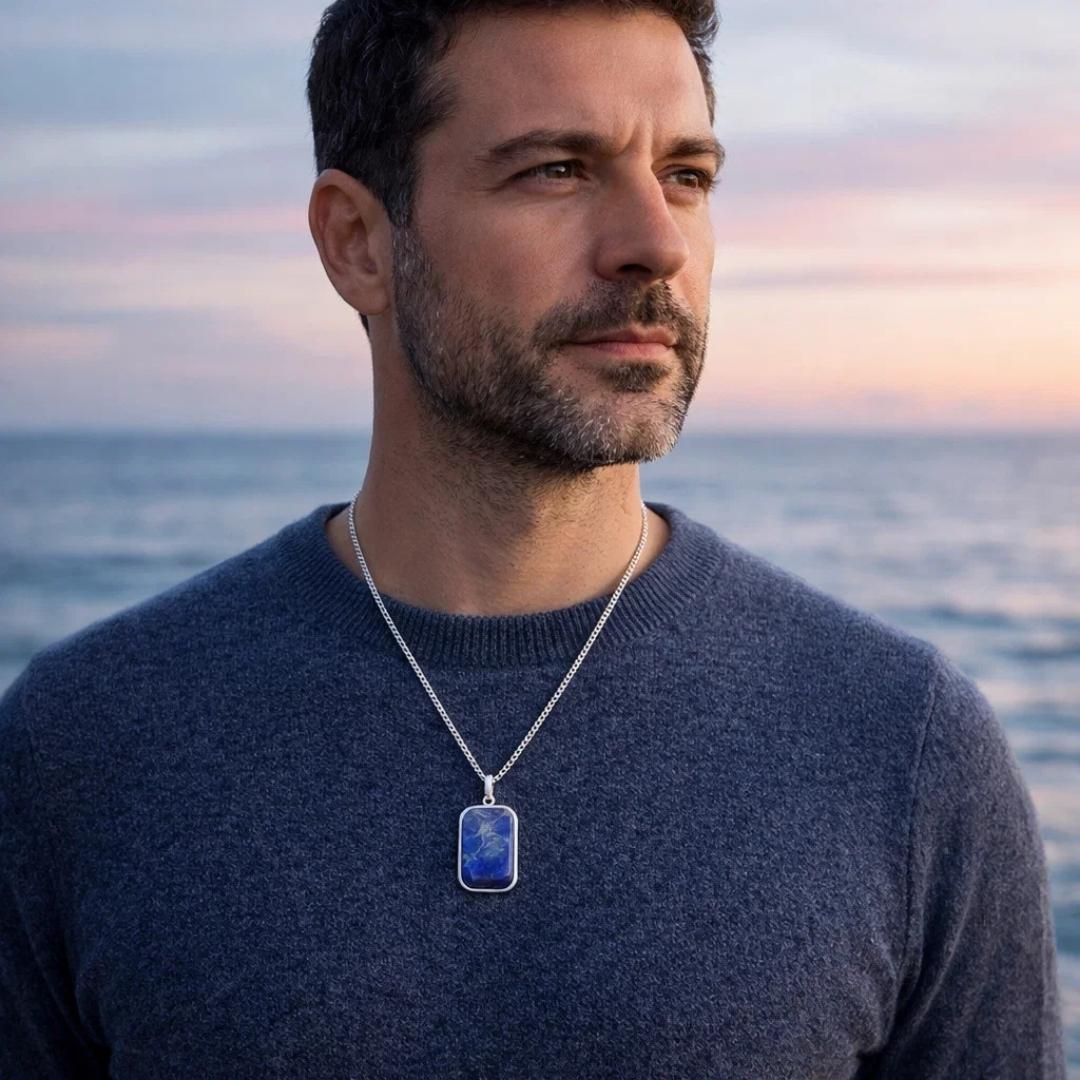 Catena in acciaio inossidabile lunga circa 45–50 cm, con pendente rettangolare in lapislazzuli naturale incastonato in montatura lucida. Resistente, confortevole e ideale da indossare ogni giorno, da solo o abbinato ad altri gioielli marittimi.