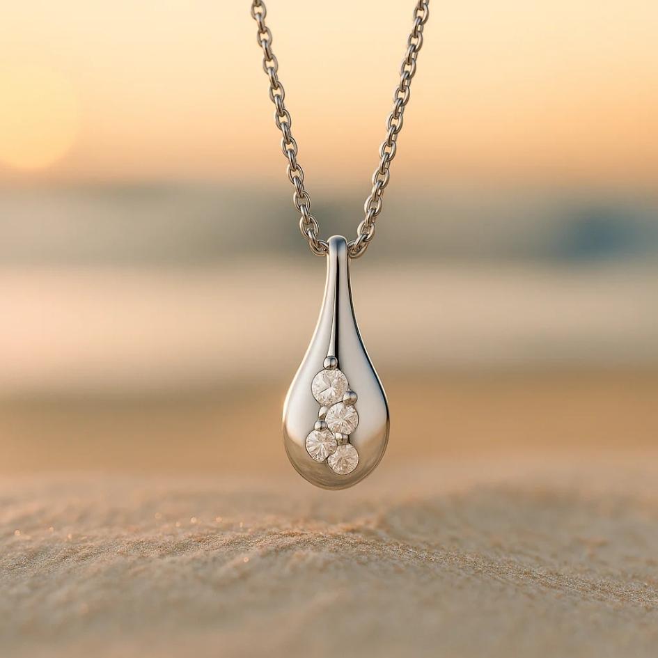 Il suo pendente a forma di goccia che custodisce zirconi, che si staglia su uno sfondo chiaro e lucente, come un’onda al tramonto.