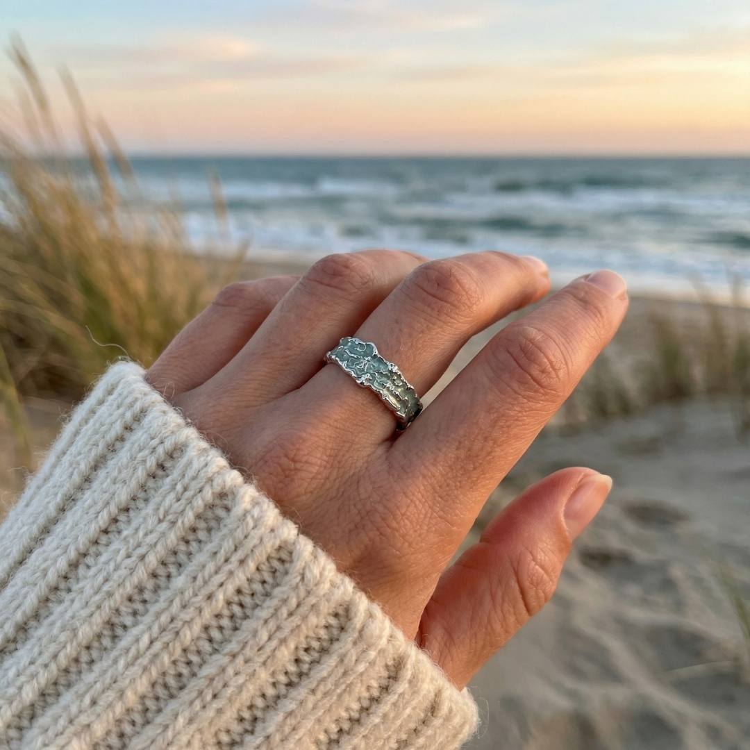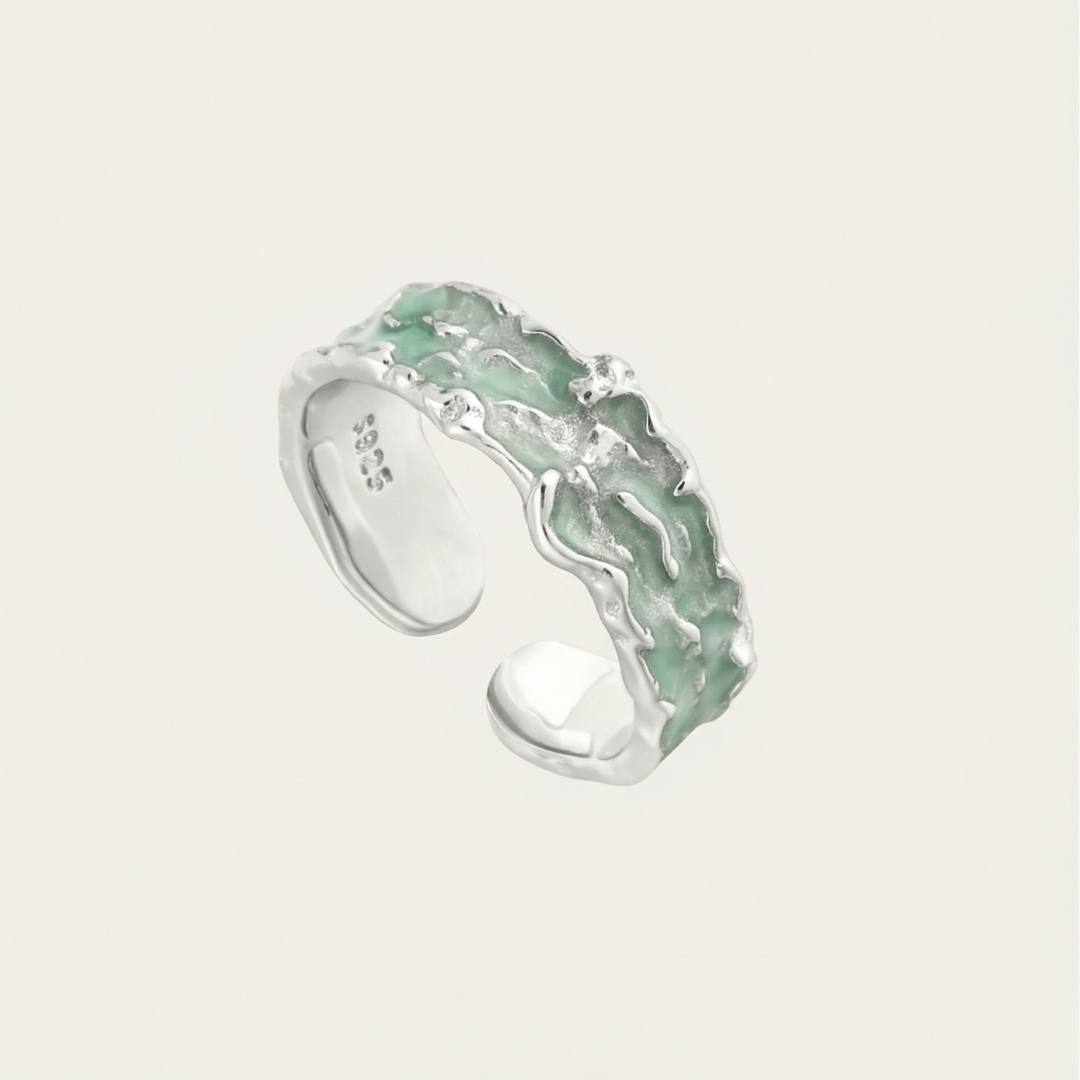 Realizzato in argento sterling 925 con smalto verde oceano applicato a mano. Anello regolabile con diametro interno base 16,9 mm, larghezza circa 7,6 mm e peso di circa 3,7 g. Un gioiello solido ma confortevole, pensato per accompagnarti ogni giorno.