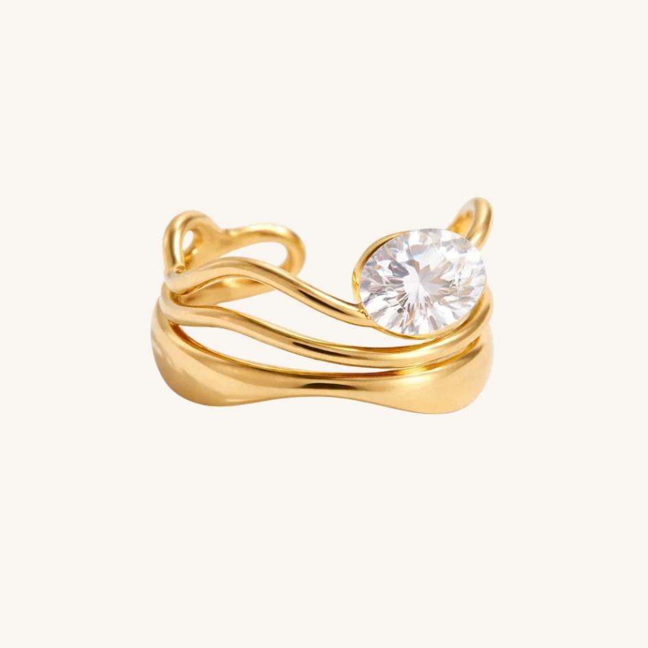 Realizzato in acciaio inossidabile con placcatura dorata e brillante zircone incastonato, è un anello regolabile pensato per adattarsi con comodità a diverse misure di dito.