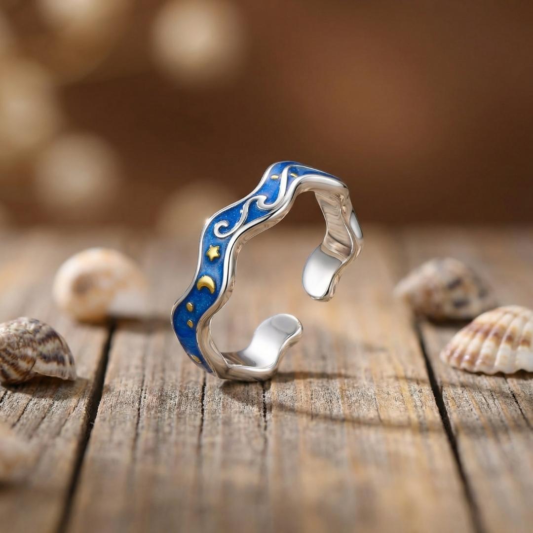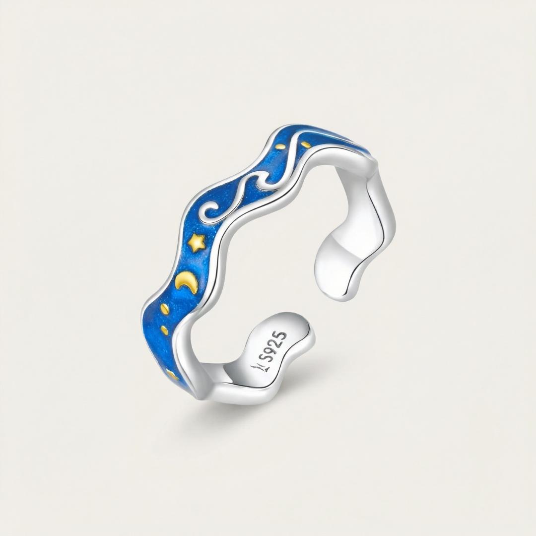Un’onda blu navy decorata con luna e stelle dorate, come un frammento di cielo riflesso nell’acqua. Linee morbide e luminose che avvolgono il dito con eleganza.