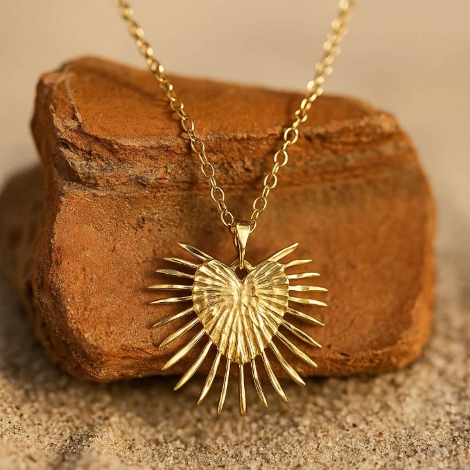La catena misura 45 cm e il pendente, scolpito con finitura martellata e raggi in rilievo, aggiunge un tocco deciso e luminoso a qualsiasi look. Ideale da portare sola o abbinata ad altre collane per uno stile a strati.