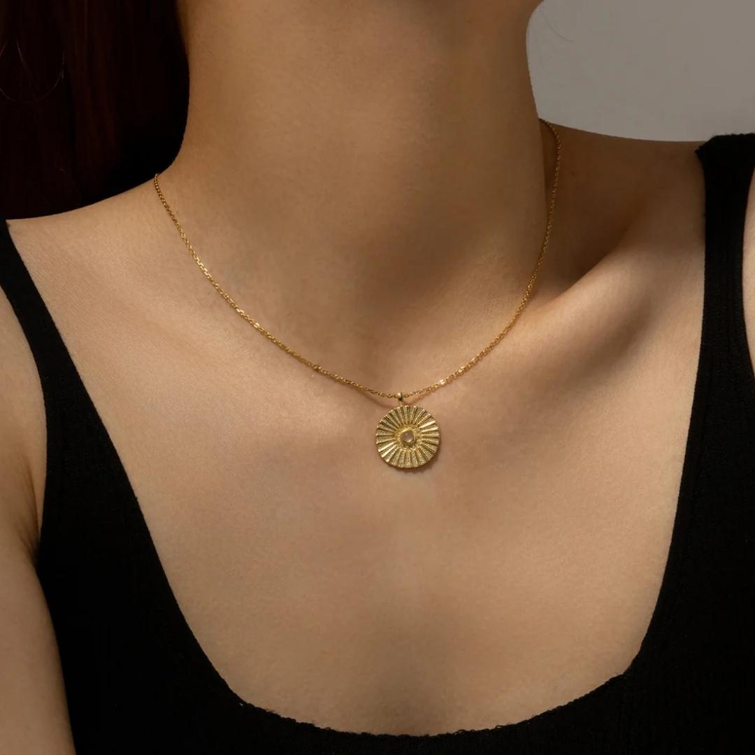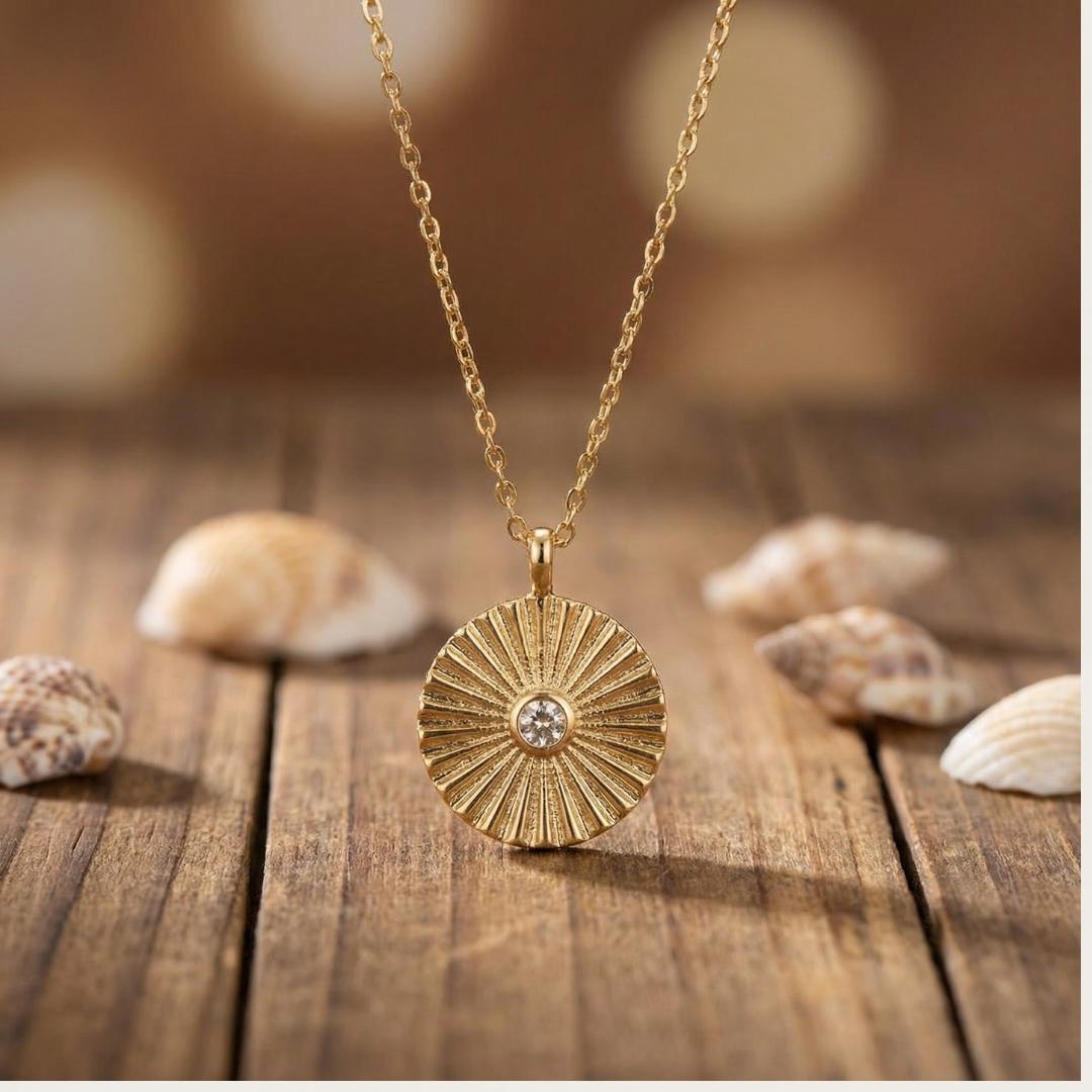 Un sole inciso che riposa sulla pelle come un talismano dorato. Linee radiali che catturano la luce e la riflettono con delicatezza, creando un’aura calda e magnetica.