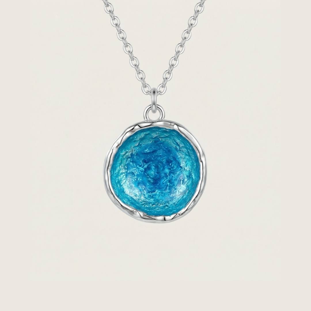 Talassia custodisce la profondità dell’oceano in un piccolo cerchio di luce blu. Lo smalto ricorda l’acqua che si muove lentamente tra le onde, creando un ciondolo delicato che sembra portare con sé il respiro del mare.