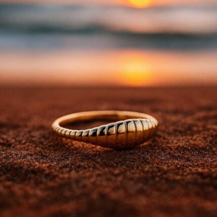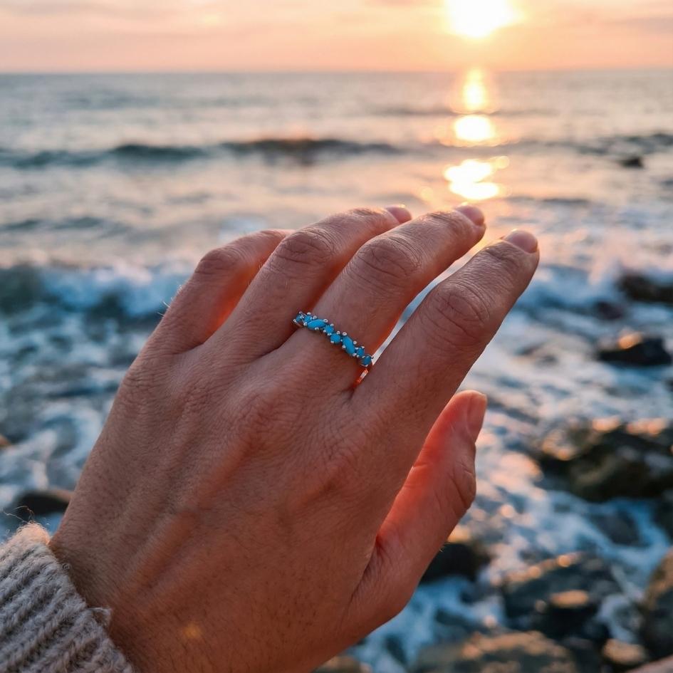 Talya è un anello sottile che sembra una piccola cresta d’onda che corre sul dito. Le pietre turchesi, allineate come gocce di mare, regalano un tocco di colore elegante ma discreto, perfetto da solo o abbinato ad altri anelli.