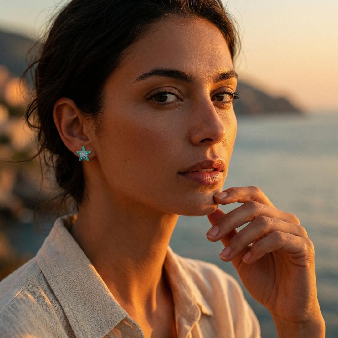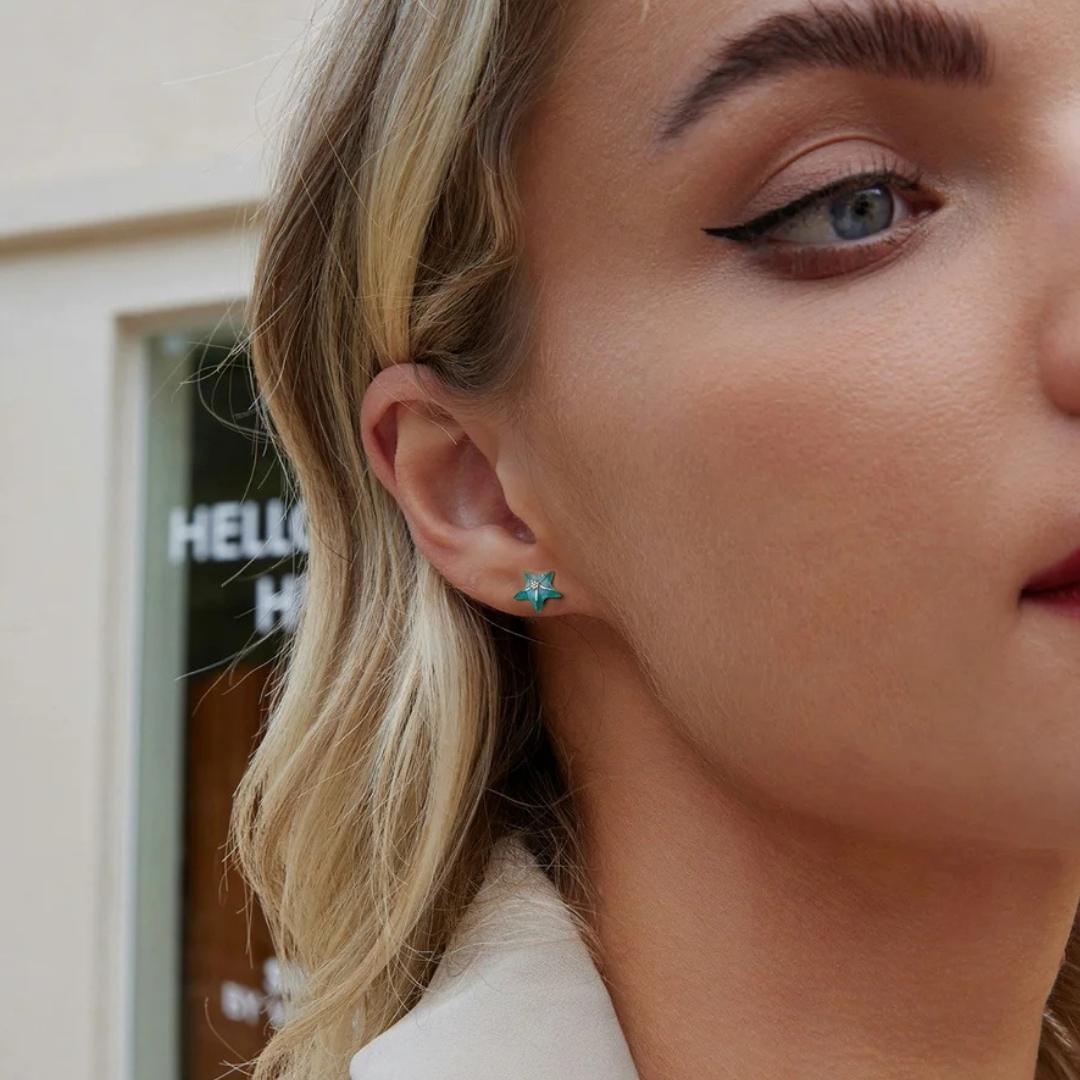 Realizzati in Argento Sterling 925 con smaltatura applicata a mano e zirconi luminosi incastonati. Design a stella marina con chiusura a perno, leggeri e confortevoli. Ipoallergenici e senza nichel, adatti all’uso quotidiano.