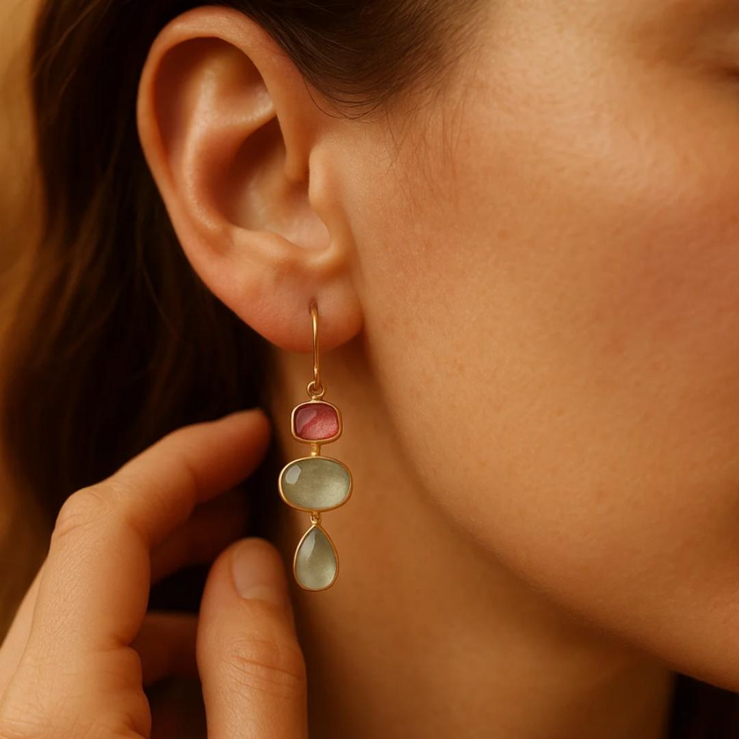 Tre pietre, tre tonalità vibranti — rosso, verde e azzurro — si susseguono in un equilibrio perfetto, come note in una melodia allegra.