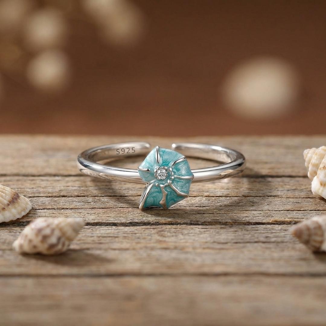 Una conchiglia color acquamarina che custodisce un punto di luce al centro, come un piccolo tesoro nascosto tra le onde. Delicata, luminosa, essenziale.