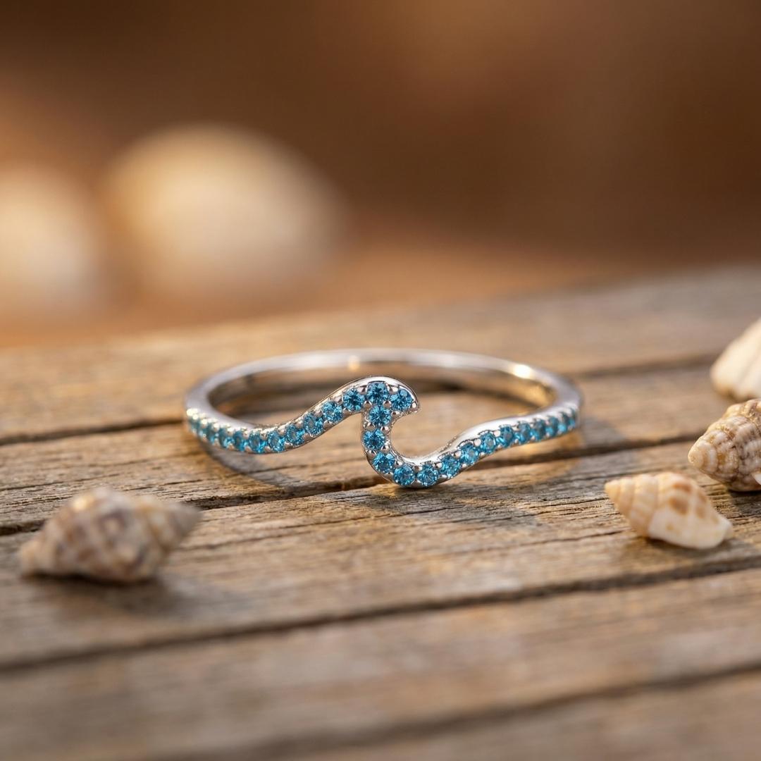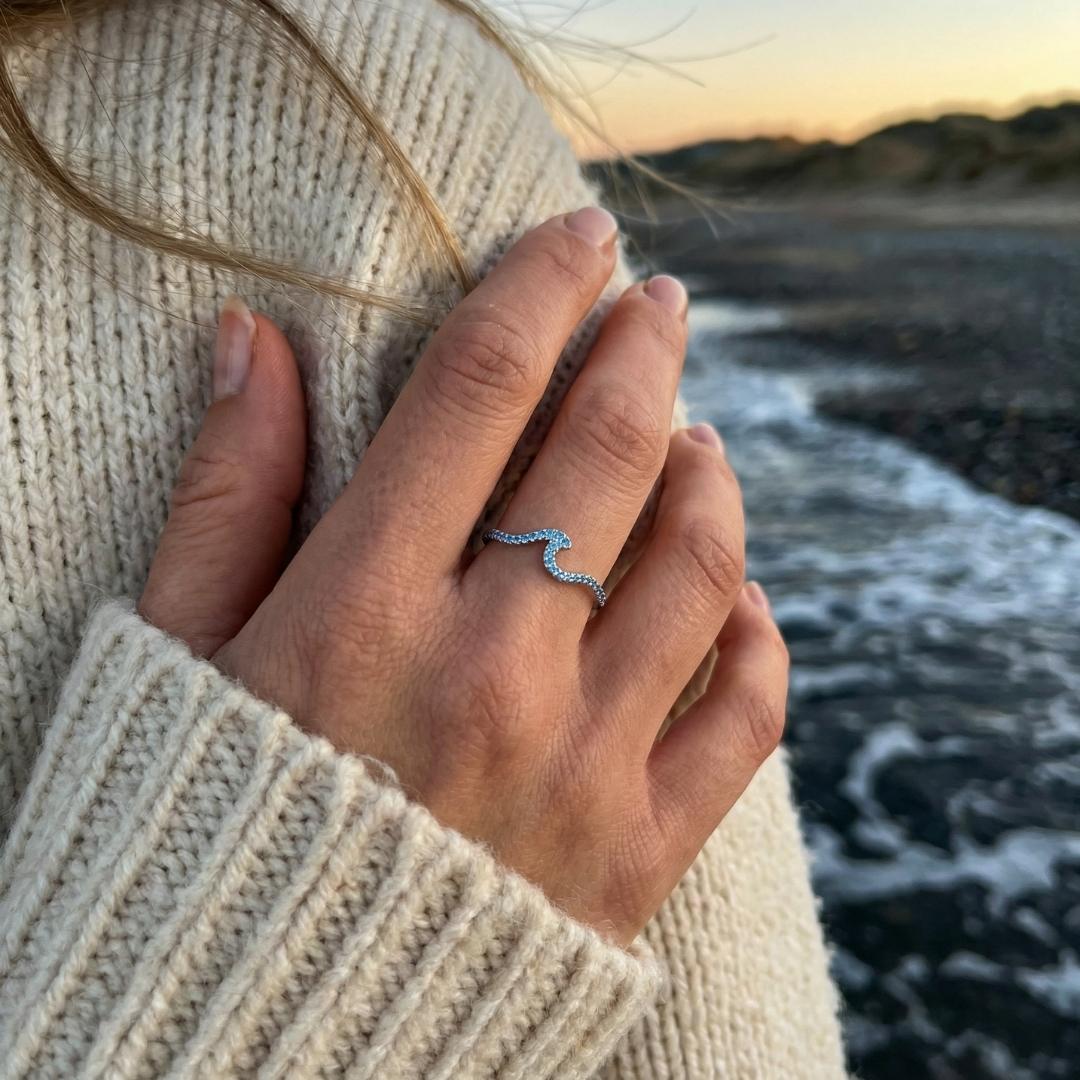 Un’onda sottile che si chiude su se stessa, come un segreto custodito dall’oceano. Gli zirconi azzurro chiaro catturano la luce e la trasformano in piccoli riflessi d’acqua.