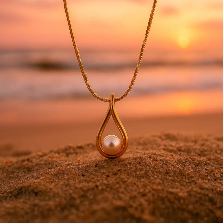 La collana Yamira unisce la resistenza dell’acciaio inossidabile dorato alla delicatezza senza tempo di una perla. Il pendente, dalla forma a goccia, richiama i riflessi del mare al tramonto, custodendo al suo interno un punto di luce puro e raffinato.