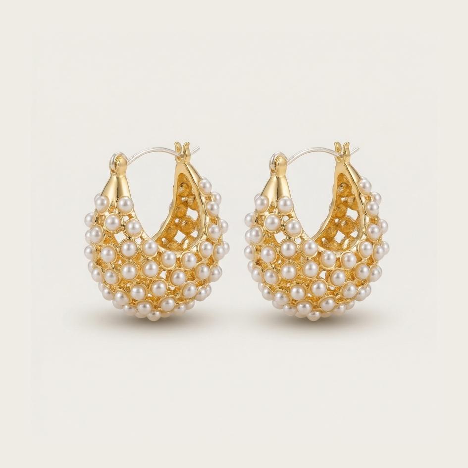 Gli orecchini Zahara misurano 2,5×2,5 cm e sono realizzati in ottone smaltato dorato, con una composizione a grappolo di perle sintetiche create in laboratorio, selezionate per la loro brillantezza e perfetta rotondità.