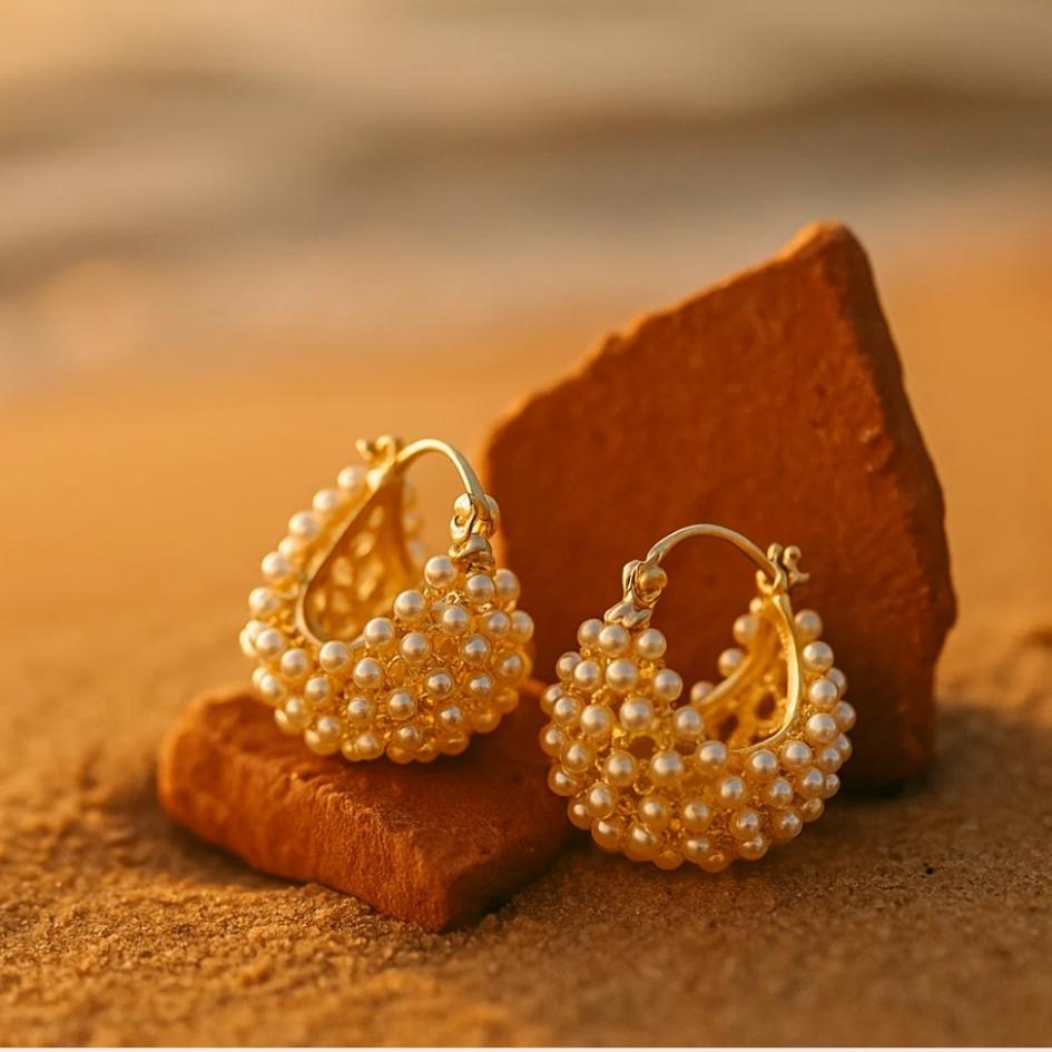 Zahara è un frammento di marea trasformato in gioiello. Come schiuma che si raccoglie tra i coralli all’alba, questi orecchini danzano intorno al viso con la grazia di una risacca dorata.