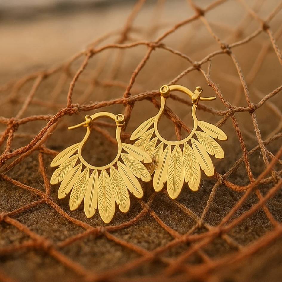 Gli orecchini Zahara si ispirano a delicate piume che si aprono al vento, catturando i riflessi dorati del tramonto sul mare.